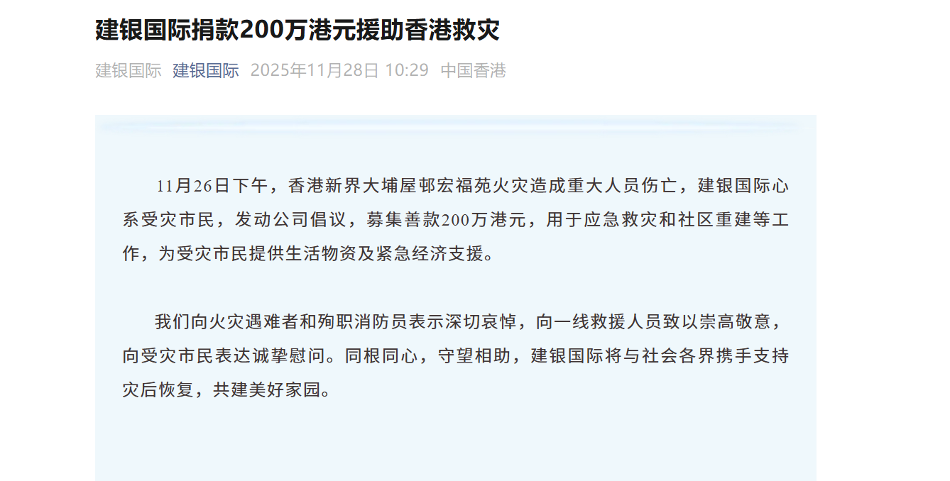 11月28日,建银国际发布公告称,建银国际心系受灾市民,发动公司倡议,募集善款200万港元,用于应急救灾和社区重建等工作,为受灾市民提供生活物资及紧急经济支援。并向火灾遇难者和殉职消防员表示深切哀悼,向一线救援人员致以崇高敬意,向受灾市民表达诚挚慰问。同根同心,守望相助,建银国际将与社会各界携手支持灾后恢复,共建美好家园。