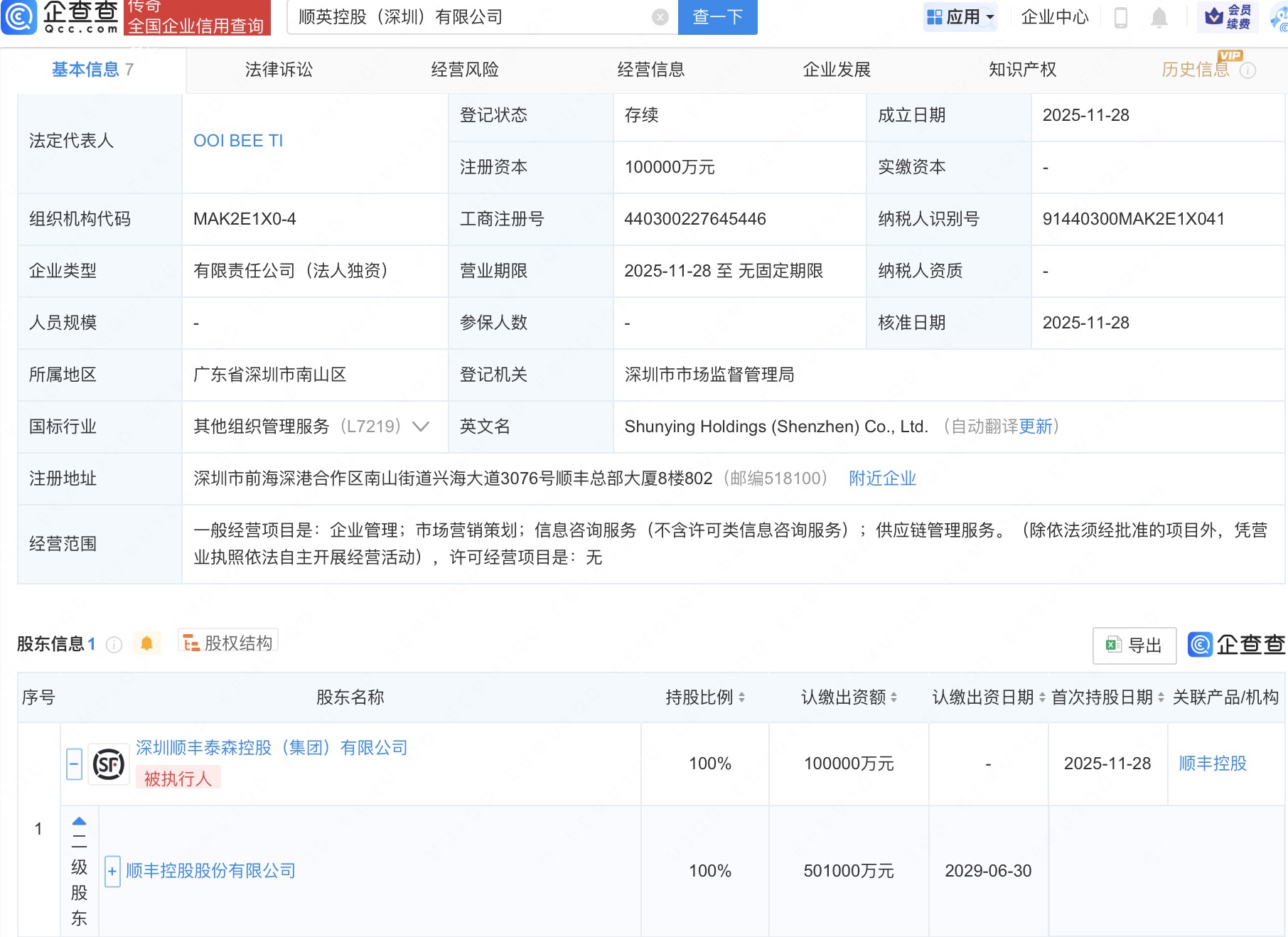 近日,顺英控股(深圳)有限公司成立,注册资本10亿元,经营范围包含:企业管理;市场营销策划;信息咨询服务(不含许可类信息咨询服务);供应链管理服务。企查查股权穿透显示,该公司由顺丰控股(002352)间接全资持股。